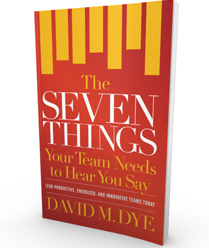 Productive, energized, and innovative teams are critical to your success. In The Seven Things Your Team Needs to Hear You Say, author David M. Dye shares practical and encouraging tools you can use to cultivate engaged, responsible, and results-oriented teams. Whether you’re a new frontline leader, a small business owner, or a veteran manager, The Seven Things Your Team Needs to Hear You Say will inspire you to inspire your team. You don’t need buckets of charisma – they just need to hear you say these seven things.